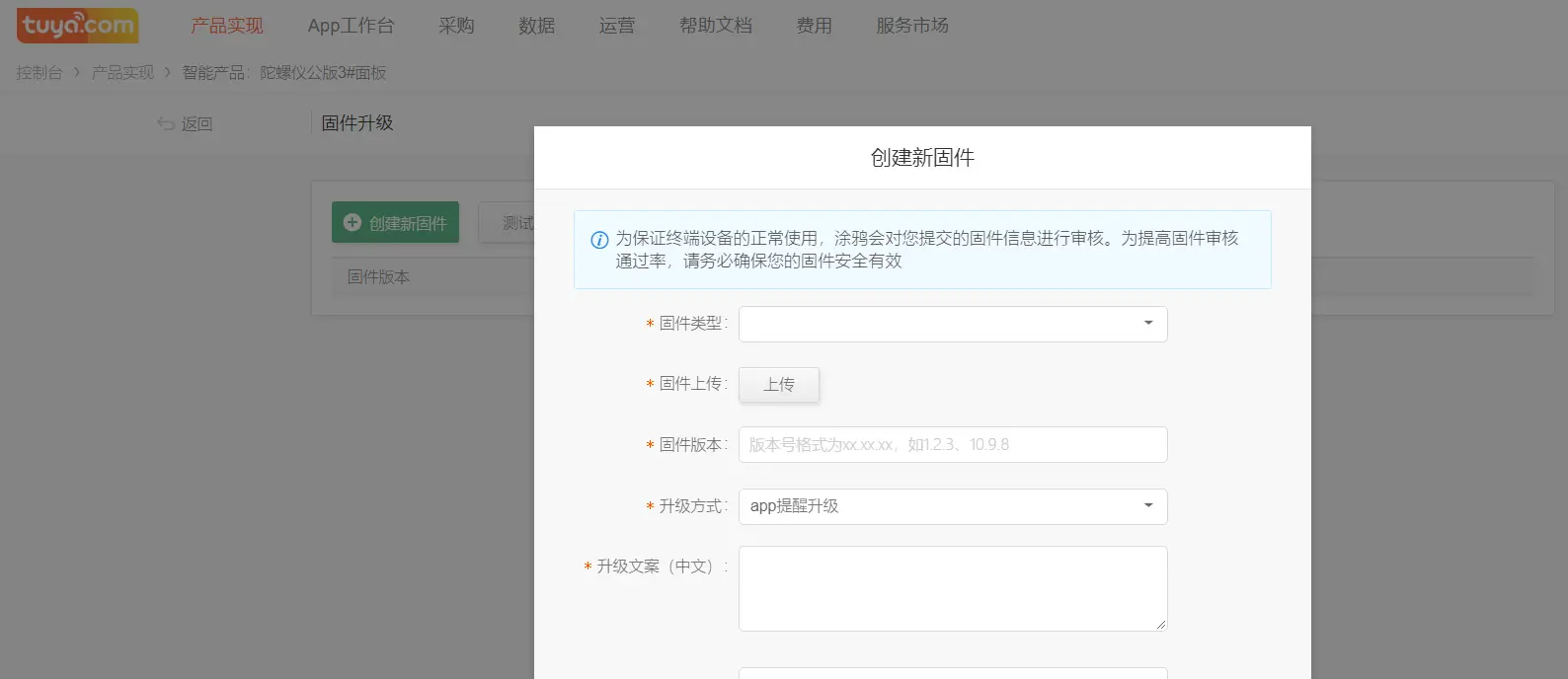 在IoT平台“拓展功能”的“固件升级”,可以自定义上传MCU固件,固件版本、升级信息等都支持自定义管理。
