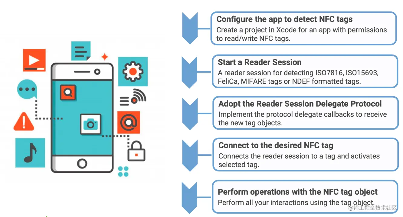 - 开发者可以通过iOS CoreNFC Framework提供的native protocols与 tags 直接通信。