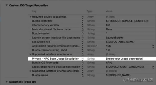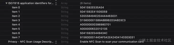 如果你需要支持ISO7816, ISO15693, FeliCa, and MIFARE tags,则需要在info.plist 上添加支持对应的AID,例如使用ISO7816: