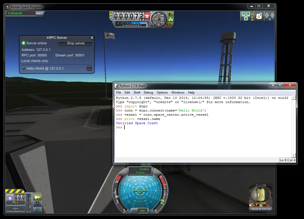 import krpc conn = krpc.connect(name='Hello World') vessel = conn.space_center.active_vessel print(vessel.name)
