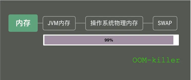这个时候,Linux会启动oom-killer,杀死占用内存最大的进程,这个时候大概率是你可爱的JVM宝贝进程。