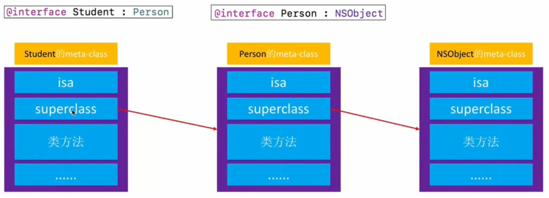 当Student的class要调用Person的类方法时,会先通过isa指针找到Student的meta-class,然后通过superclass找到Person的meta-class,最后找到类方法的实现进行调用
