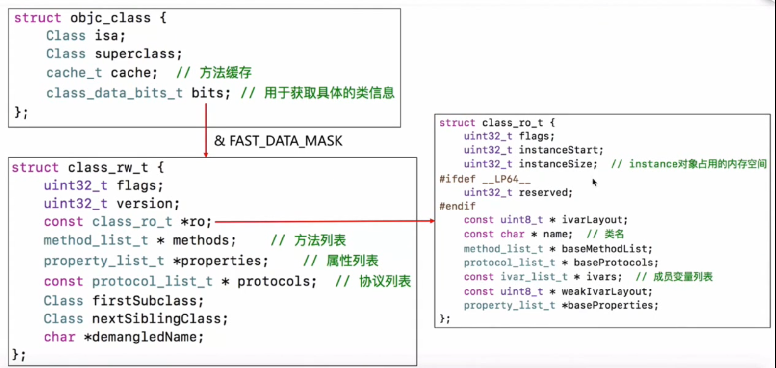 class_data_bits_t bits; // class_rw_t * plus custom rr/alloc flags-用于获取具体的类信息