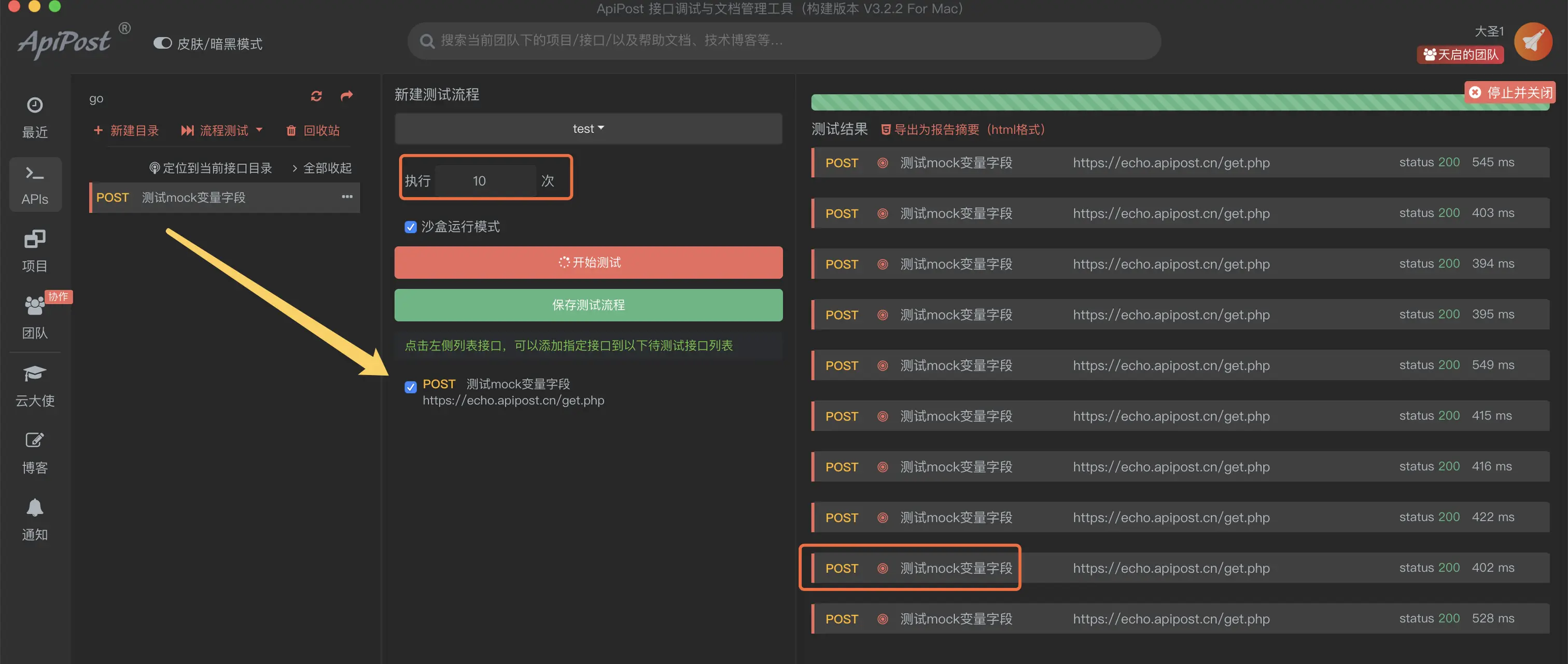 这个时候,我们就可以利用mock生成我们需要的数据,并结合ApiPost内置的流程测试功能进行接口的测试。
