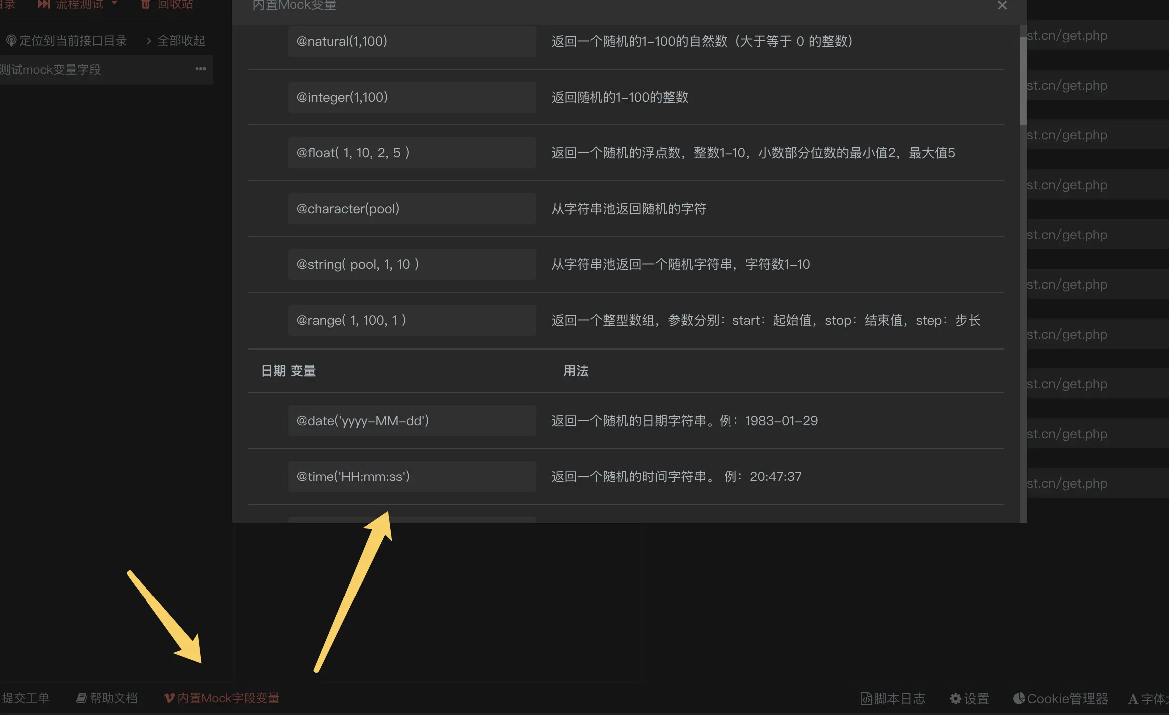 @email() 随机生成一个邮件地址,如:example@163.com @ip() 随机生成一个IP地址,如:127.0.0.1 @county(true) 随机生成中国区县地址,如:北京海淀区 你可以通过点击apipost客户端左下角的“内置mockjs字段变量”进行查看获取。