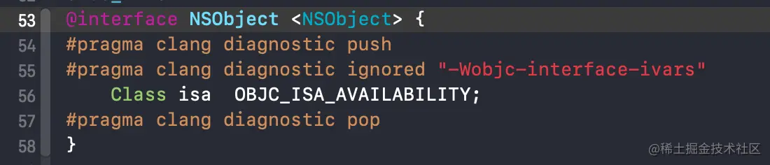 当然不转化成 cpp 文件,而是直接进入 NSObject 的头文件,可以看到其定义为: