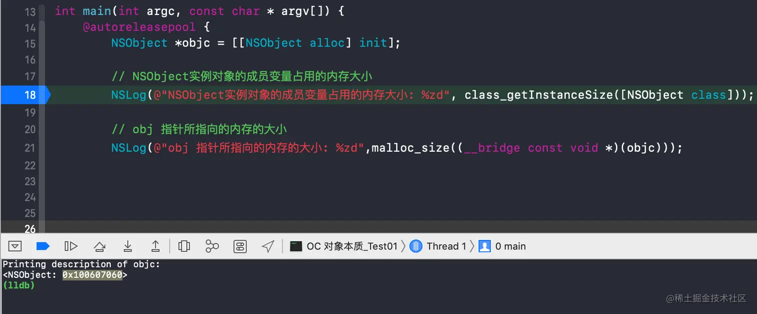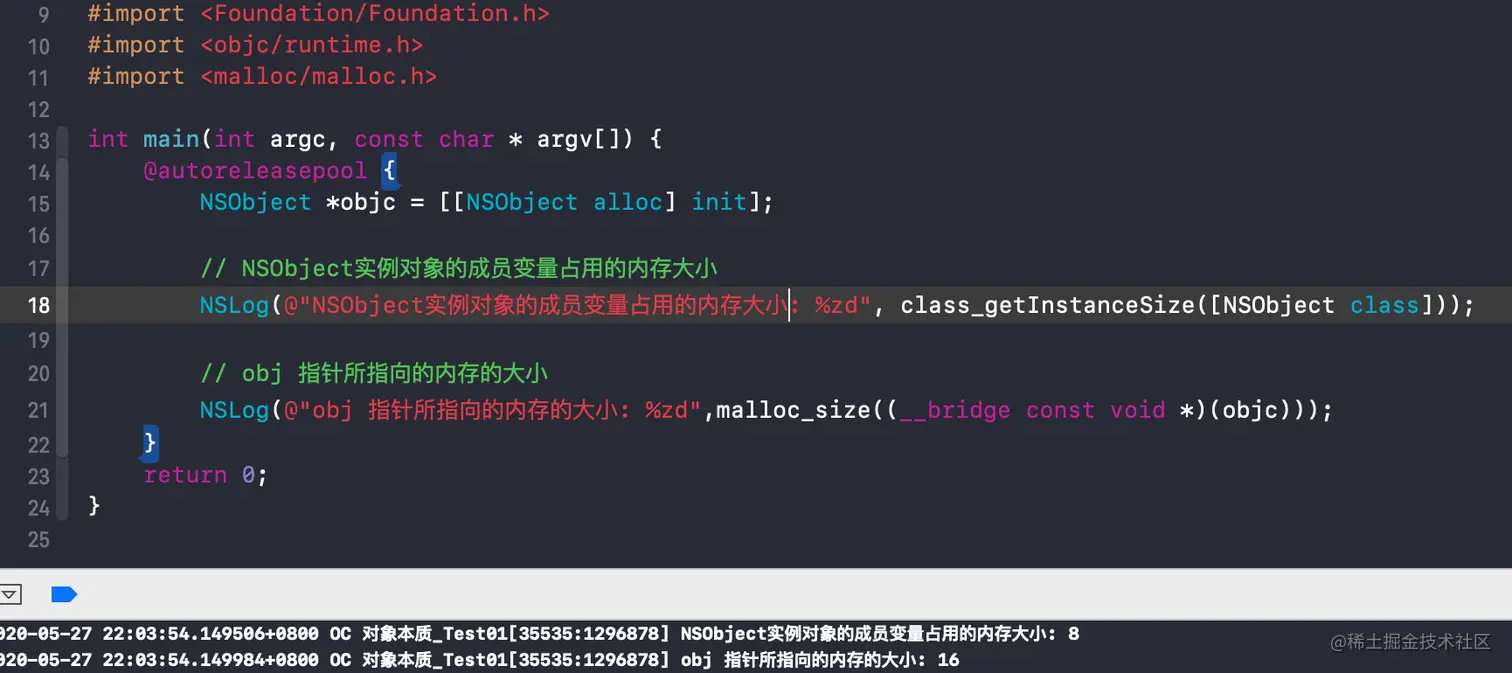 可以看到 NSObjc 对象,函数class_getInstanceSize返回的内存大小是8 字节,malloc 分配的内存大小是 16。
