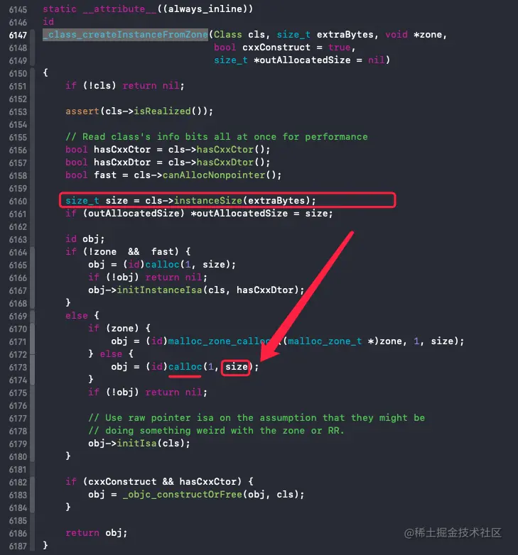 ,calloc 的入参 size 是通过 size_t instanceSize(size_t extraBytes)
