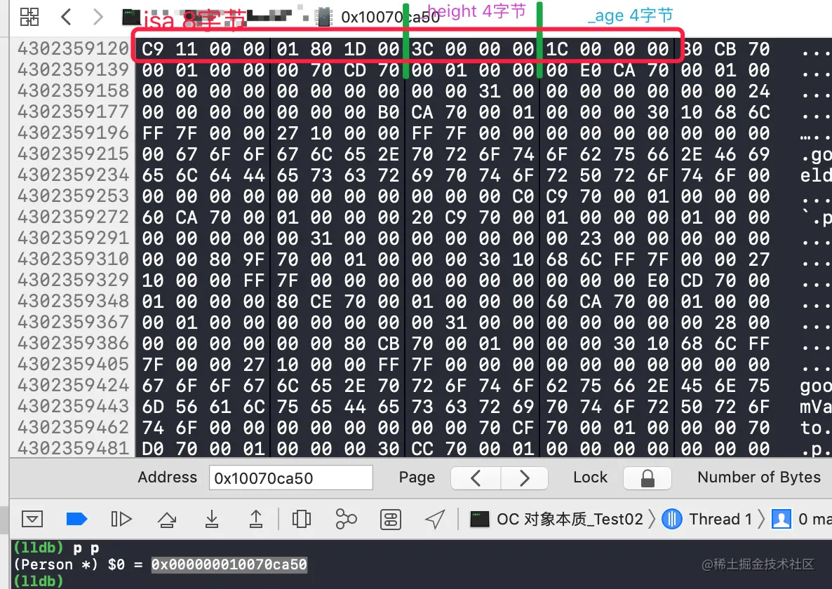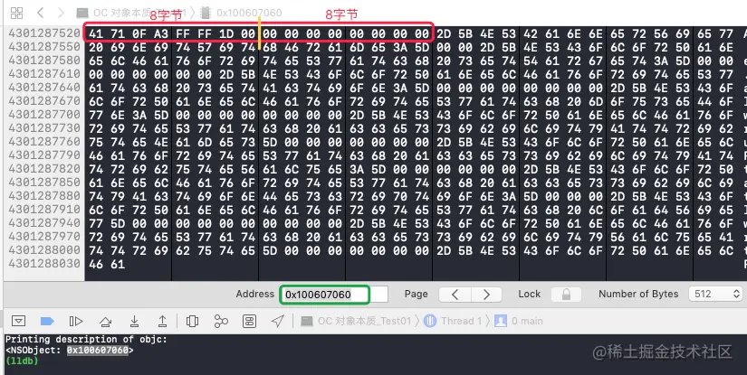 断点调试,可以看到 objc 的地址为 “0x100607060”。