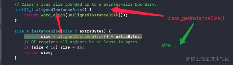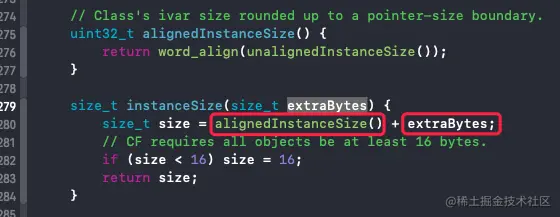 中的 size_t size = alignedInstanceSize() + extraBytes;