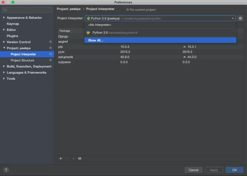 这里我们可以看到,我们的Python Interpreter是虚拟环境的,所以里面安装的包并不是很多。同时我们也看到了上一篇文章我们所安装的Django2.1.x版本。