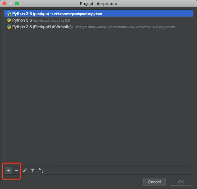 在PyCharm里面设置Python Interpreter,Mac用户可能和Windows用户的入口不太一样,但是不管怎样,其实这个东西是在Preference里面,找到Python Interpreter: