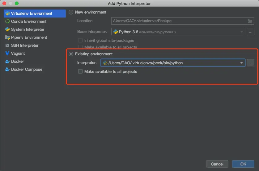 /Users/GAO/.virtualenvs/peekpa/bin/python/...虚拟环境目录(WORKON_HOME).../虚拟环境名字/bin/python