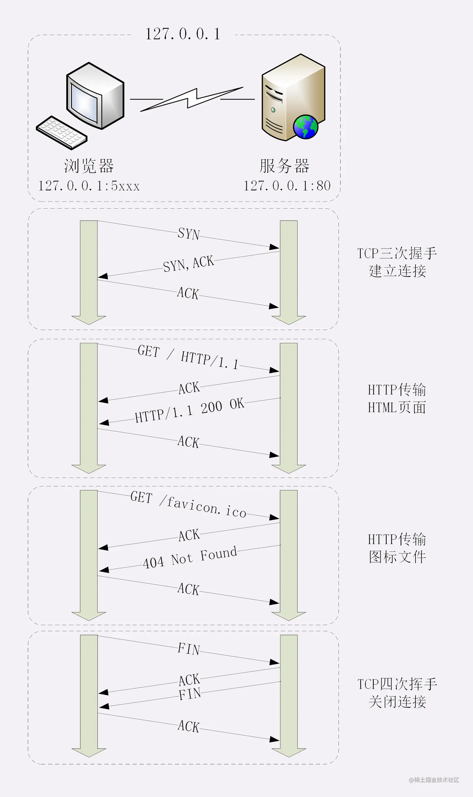 1、浏览器从地址栏的输入中获得服务器的IP地址和端口号;(如果使用的是域名,会先使用域名解析功能解析出对应的IP地址)