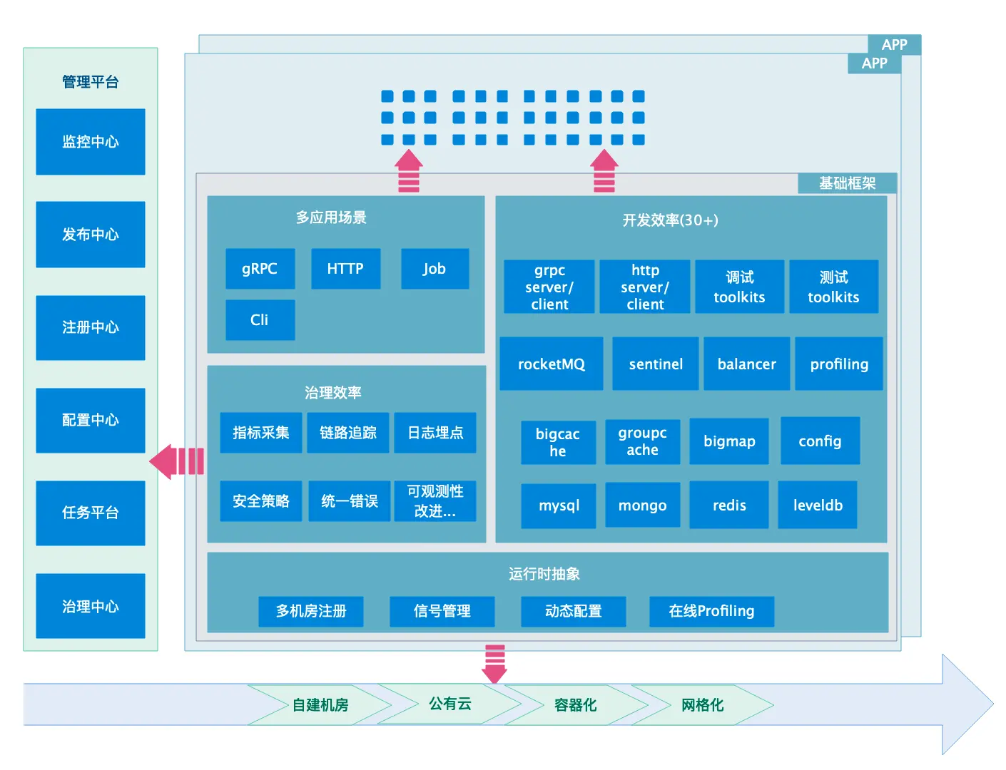 - 演进式架构: 保证服务在自建机房、容器云、网格化等基础架构变更和基础设施变更过程中的平滑迁移。