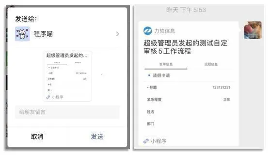 【小程序】工作流支持分享给联系人/好友,对方点击分享消息可以直接转到审批页面。