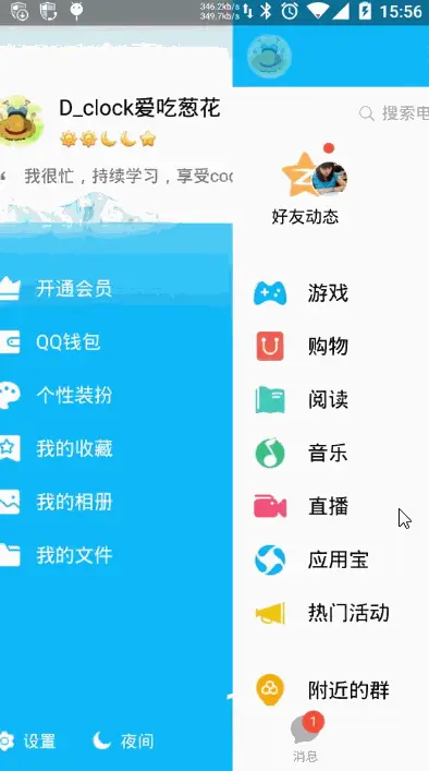 Google 为了支持这样的导航效果,推出一个新控件 —— DrawerLayout 。而在 DrawerLayout 没诞生之前,需求中需要实现侧滑导航效果时,我们必然会选择去选择一些成熟的第三方开源库(如最有名的 SlidingMenu)来完成开发 。效果上,普遍都像 手机QQ 那样: