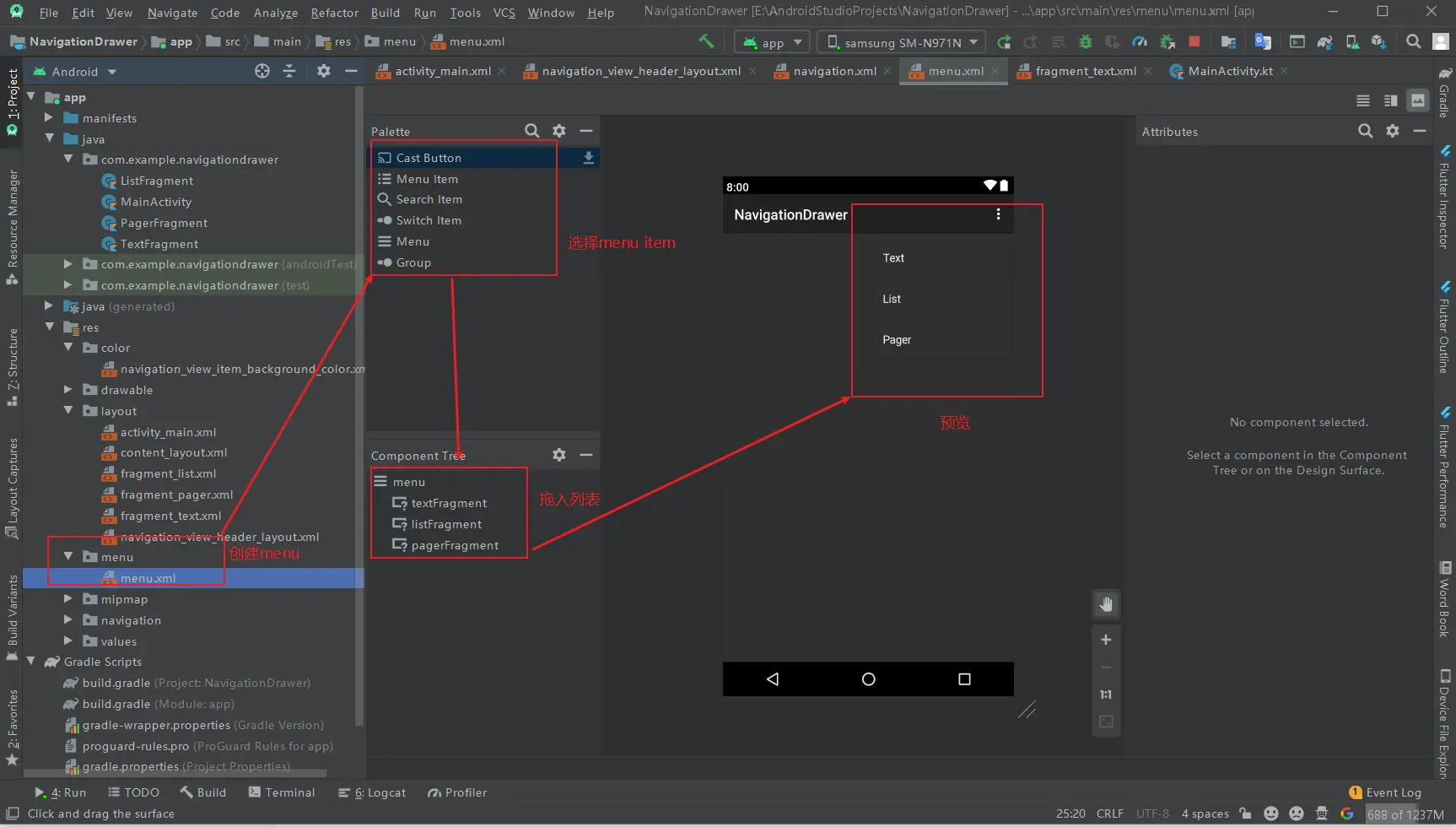 navigationView后,我们需要添加头部headerLayout和menu(这些的创建会在下面都步骤中讲到)