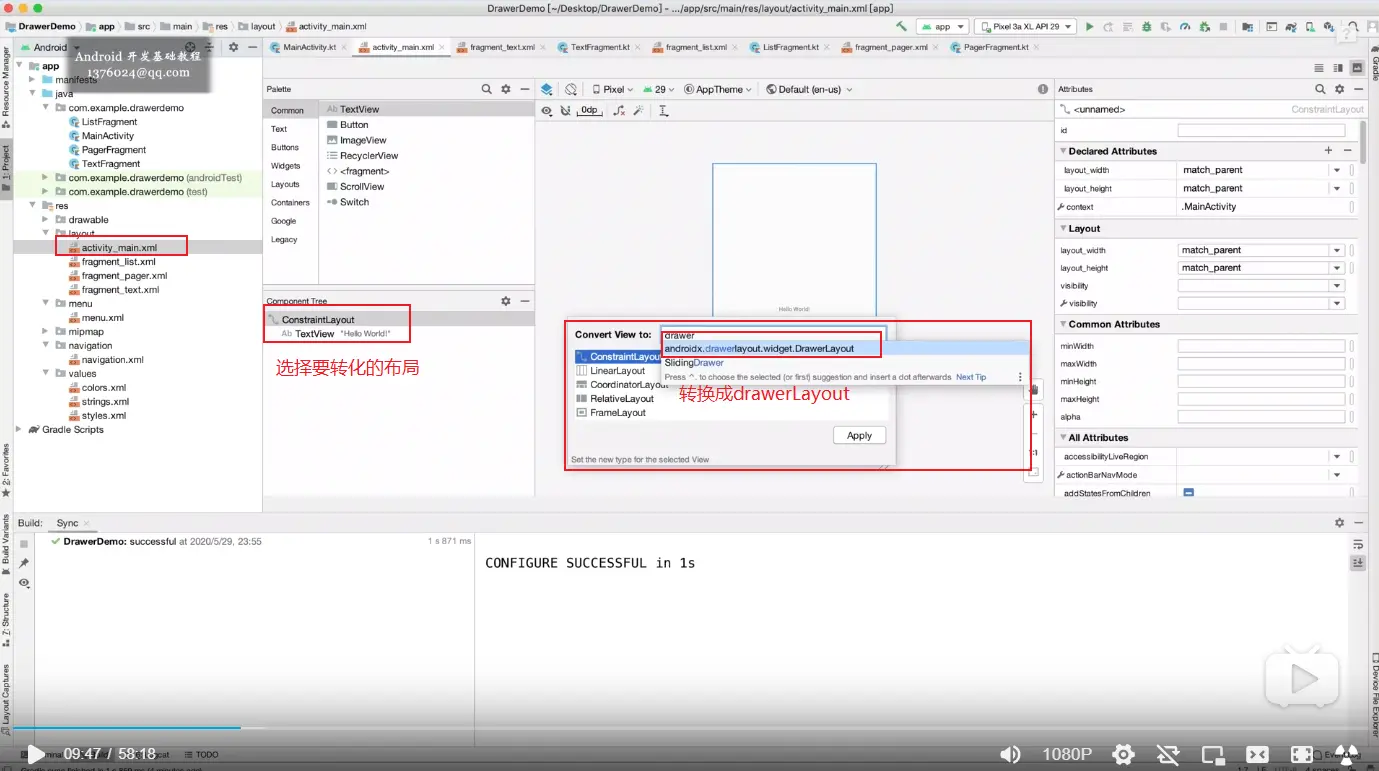 AndroidManifest.xml下修改:android:theme="@style/Theme.Design.NoActionBar"> - 抽取layout:为了更加便捷的配置某个页面的布局;