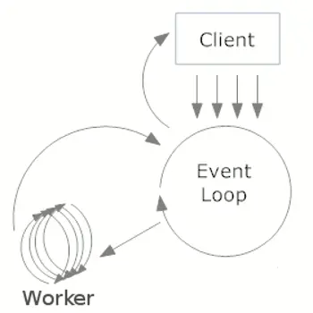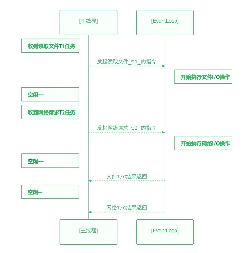 js很多时候是在进行等待操作的,比如IO操作、网络请求、等待允许结果返回...,等,因此worker设置两个线程,一个主线程,负责程序本身的运行,另一个是负责主线程与其他进程之间通信(如IO操作)的EventLoop线程。如图,上面的箭头是主线程(Main Thread),下面的线程是EventLoop,主线程控制整个流程的进行,相当于控制器,EventLoop对主线程有协程控制作用,将主线程交给他的任务执行完成后,经结果返回给主线程,并执行后续的任务。两条线程是并行的,相互不会有阻塞、副作用。主线程可能会存在一些空闲状态,但不存在等待时间(因为主线程不会等待EventLoop事件执行完成,而是EventLoop主动通知到主线程,并将结果返回),也就是主线程的任务之间不会有阻塞(资源竞争),网络请求不必等文件读取完成后开始进行,EventLoop接到任务后空闲时立即执行。
