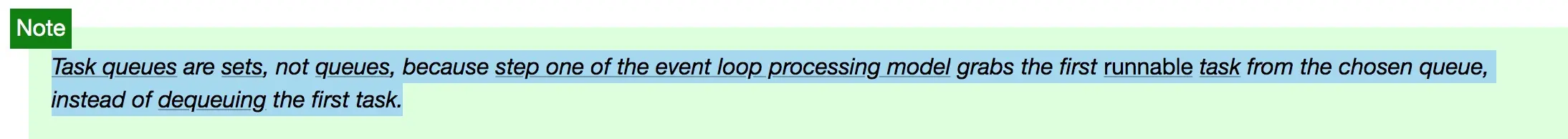 EventLoop将任务分为两种,一种是宏任务和微任务。而对应的队列就是任务的集合(set),虽然称为队列(Queue),但是并不是每次要执行任务时,从可选队列中抢夺(grab)首个可执行任务,而不是从队列中出列(dequeuing)。我的理解是等任务执行完成后,才出列。