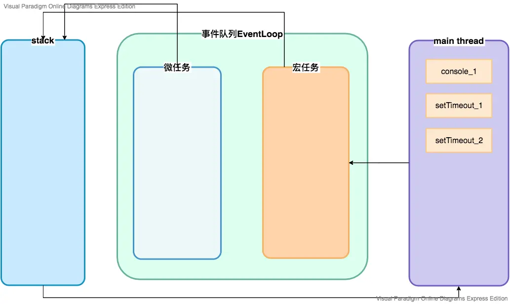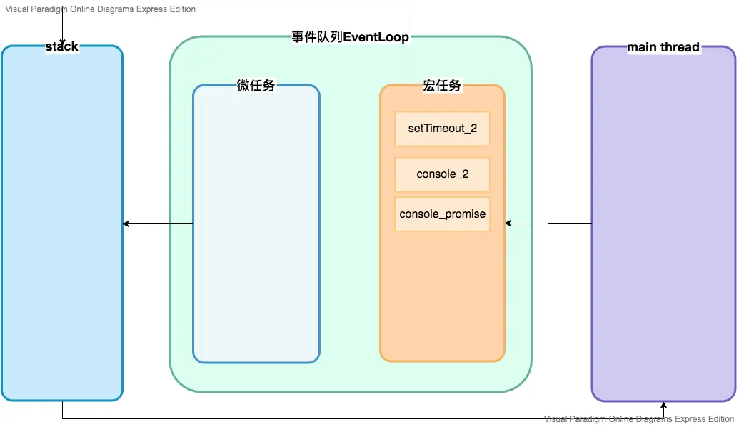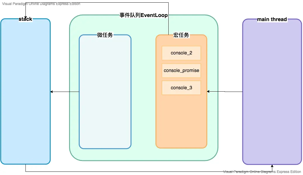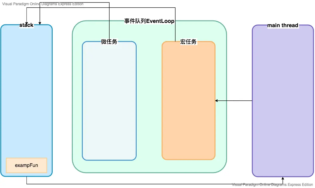 (1)exampFun会被推入栈(stack),默认主线程当前为空闲,微任务队列和宏任务队列为空