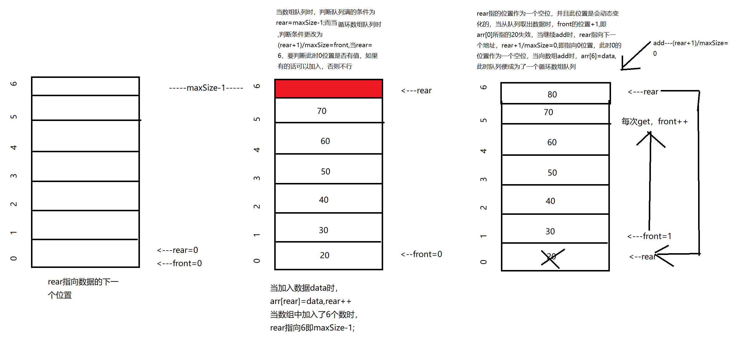 3.add方法和show方法有一点区别,最初让front和rear都指向0,当rear和front都为maxSize-1时,继续增加让它们指向队列的0地址处。