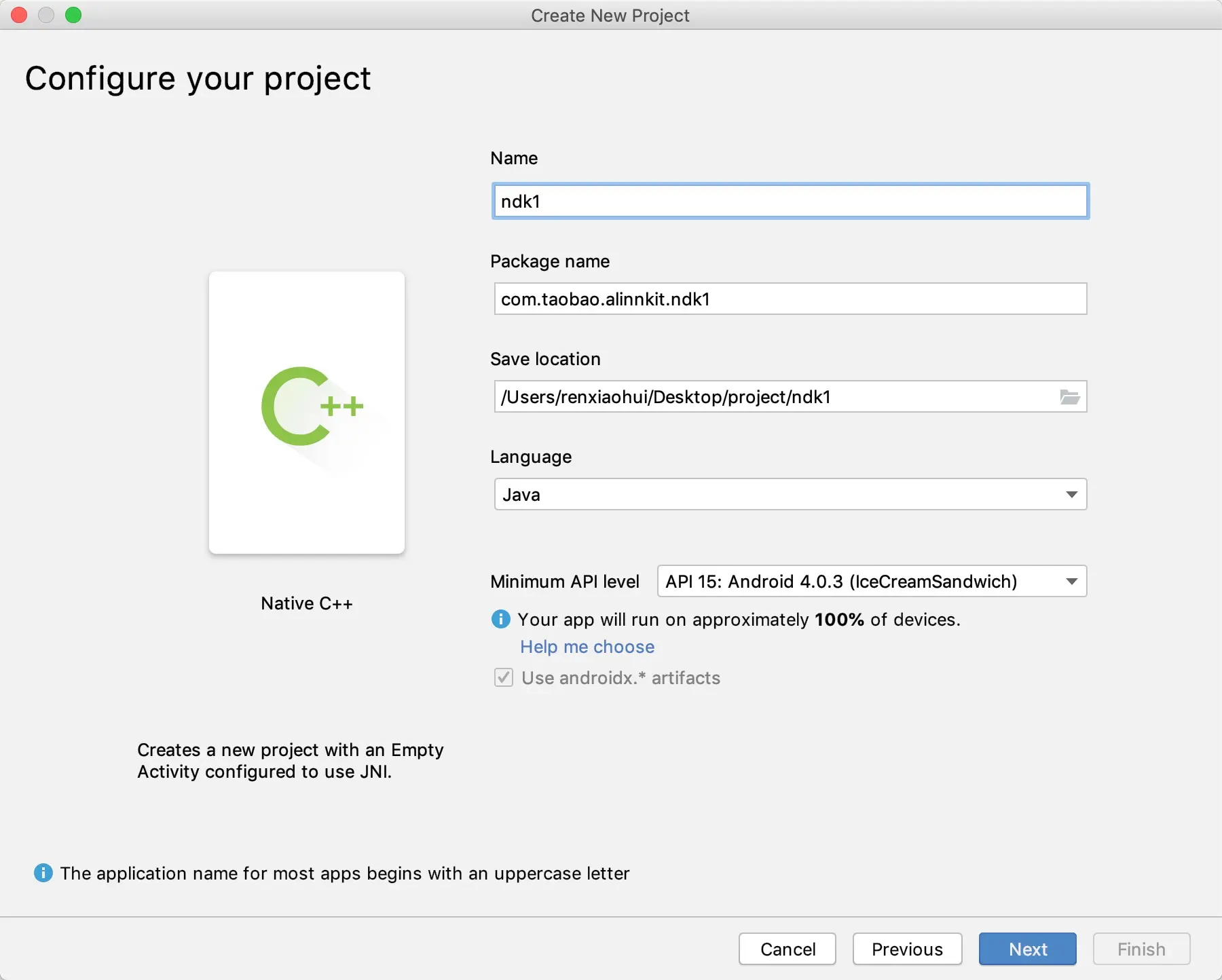 经过这三个步骤就可以自动生成一个NDK项目