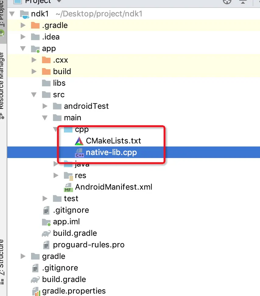 和普通的项目相比多了这个文件夹,其中native-lib.cpp是C、C++代码,CMakelist.txt是编译脚本