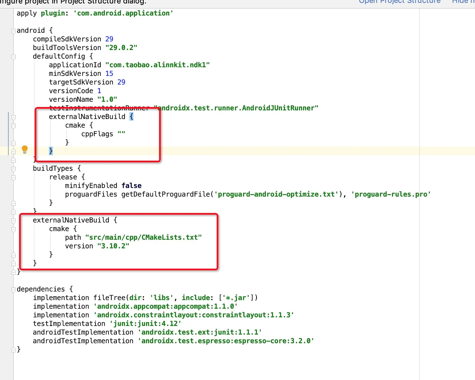 我们可以看到Gradle中俩个地方用了externalNativeBuild {},一个在defaultConfig里面一个在defaultConfig外面