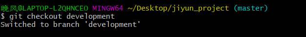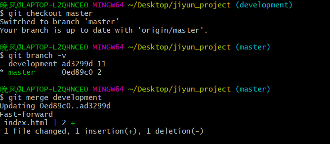 合并分支的时候需要进入到,切换到接受修改的分支上,比如说我们要把development分支合并到master分支,这个时候我们就需要通过 git chckout master 来进入到master分支然后通过 git merge development
