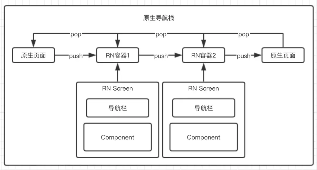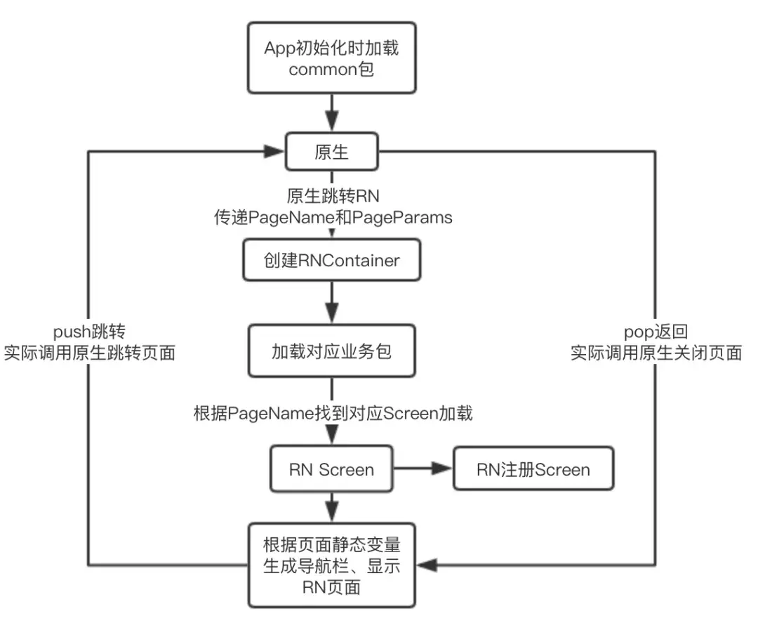 在原生主工程启动时会先预加载 common 包,当需要打开一个 RN 页面时,原生会先打开一个 RN 容器,根据传递过来的 PageName 找到对应的 business 包加载,再将 PageName 传到 RN 端,RN 端根据 PageName 找到对应的 RN 页面显示,容器根据找到的 RN 页面中的静态变量初始化原生导航栏,这样因为该 RN 容器等于一个原生页面,这个容器中只有一个 RN 页面,所以一个 RN 页面等于一个原生容器,从而将该 RN 页面嵌入到了原生导航栈中。这样就实现了 RN 和原生导航栈的统一。