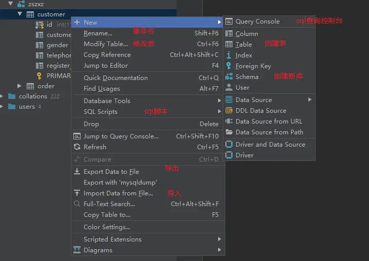 - 如下所示,我们平常关心的就是 建表, 修改表结构, 导入,导出;