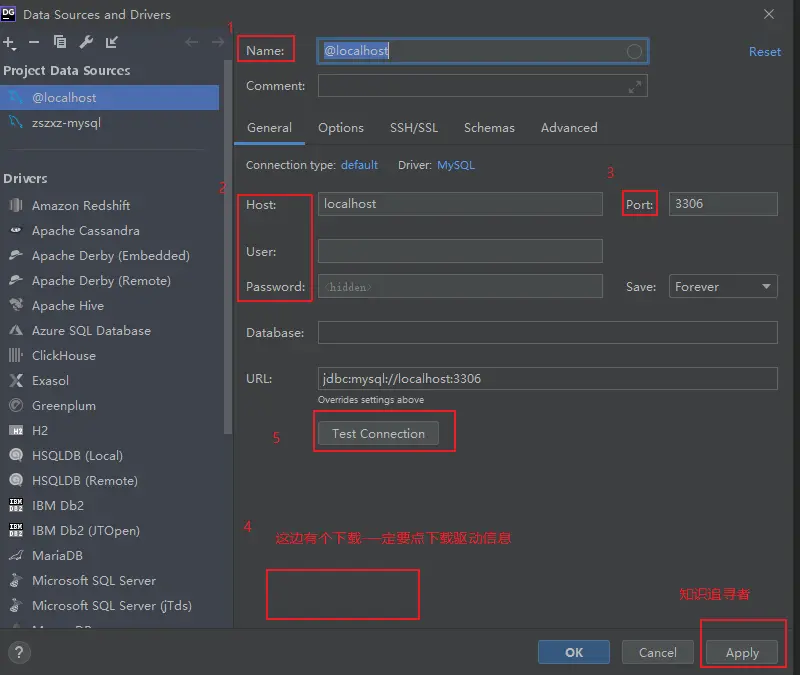 按照如下方式填写数据库连接信息,注意点是在 4 那个地方有个下载驱动,点击下载即可,然后进行连接测试,如果测试成功,说明就连接上数据库,否则根据错误提示在 Advanced 列表进行扩展属性配置;