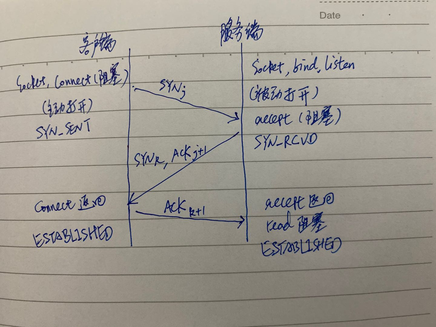 - 客户端的协议向服务器端发送了 SYN包,并告诉服务器端当前发送序列号 j,客户端进入 SYN_SENT 状态。