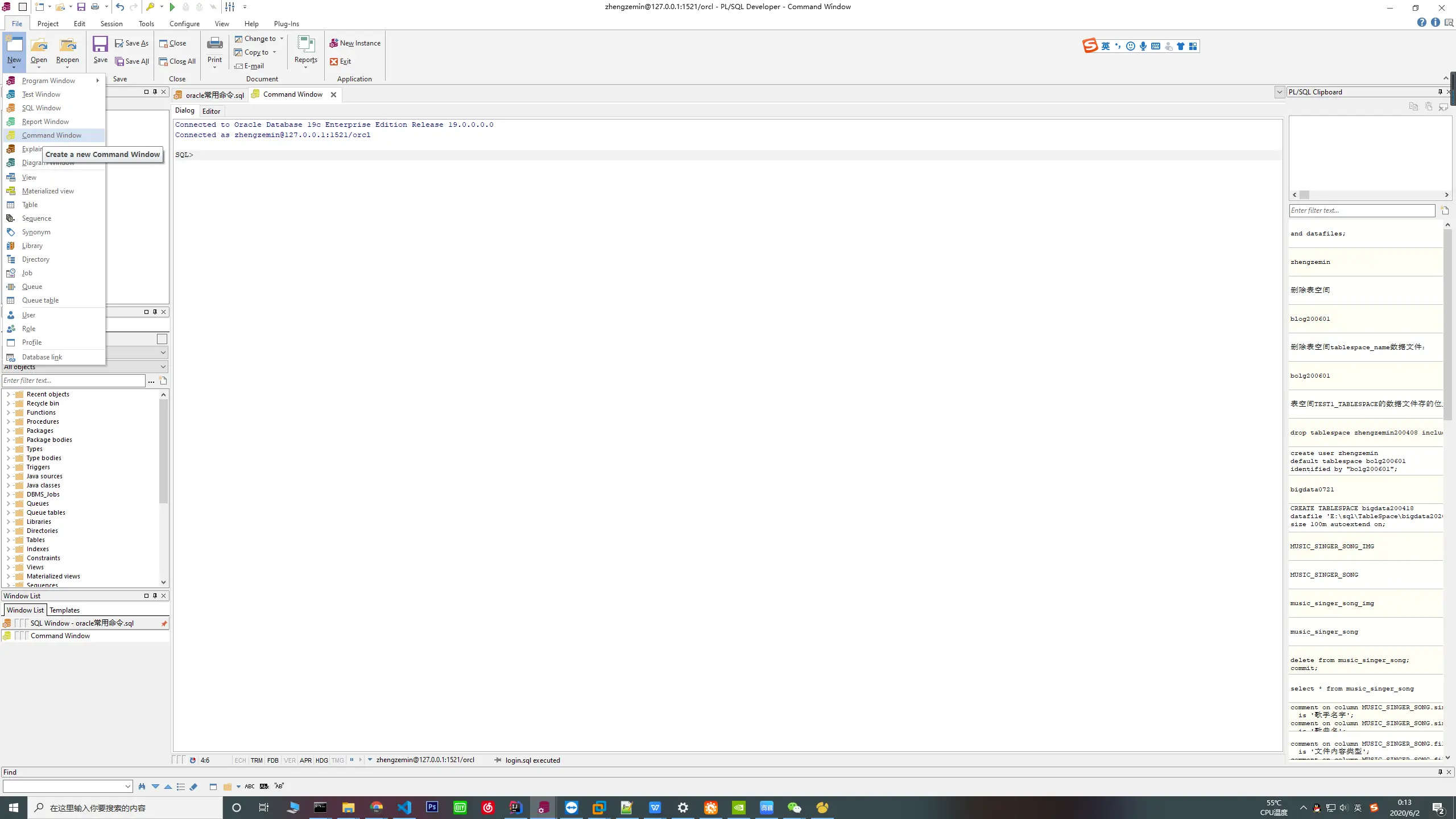 3. 使用plsql文件的命令(command)执行语句