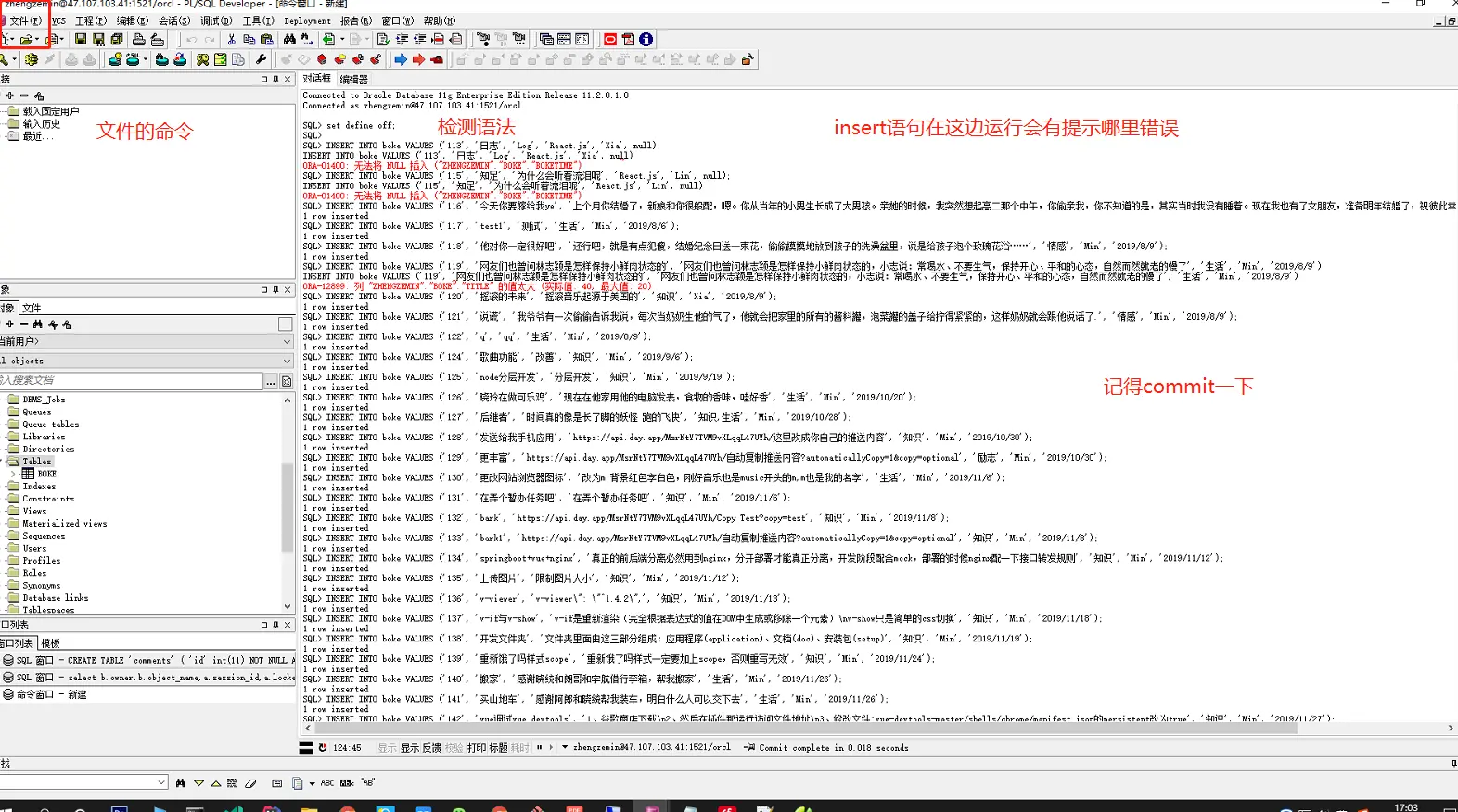 他可以帮助我们检查语法,哪里执行失败会明确表明,而且有错误信息记得执行完insert操作要commit提交一下哦