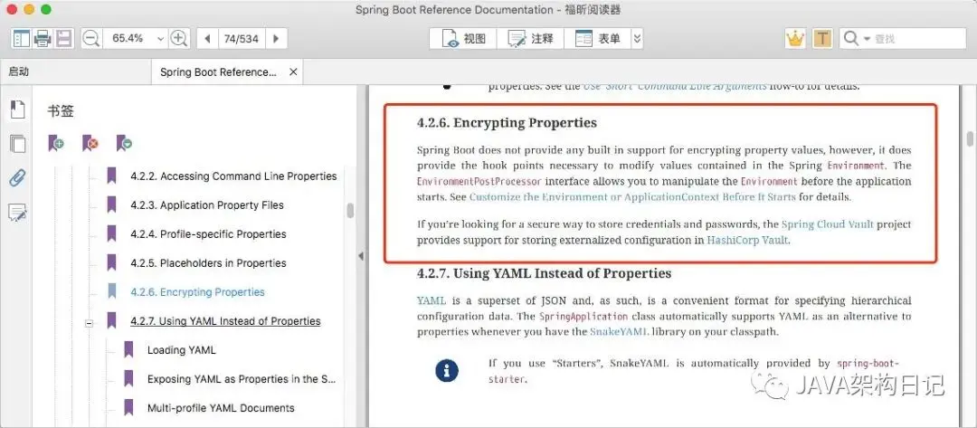 我们翻开 spring boot 官方文档,翻到 4.2.6 章节 Spring Boot 不提供对加密属性值的任何内置支持,但是提供修改 Spring 环境中包含的值所必需的扩展点 EnvironmentPostProcessor 允许在应用程序之前操作环境属性值