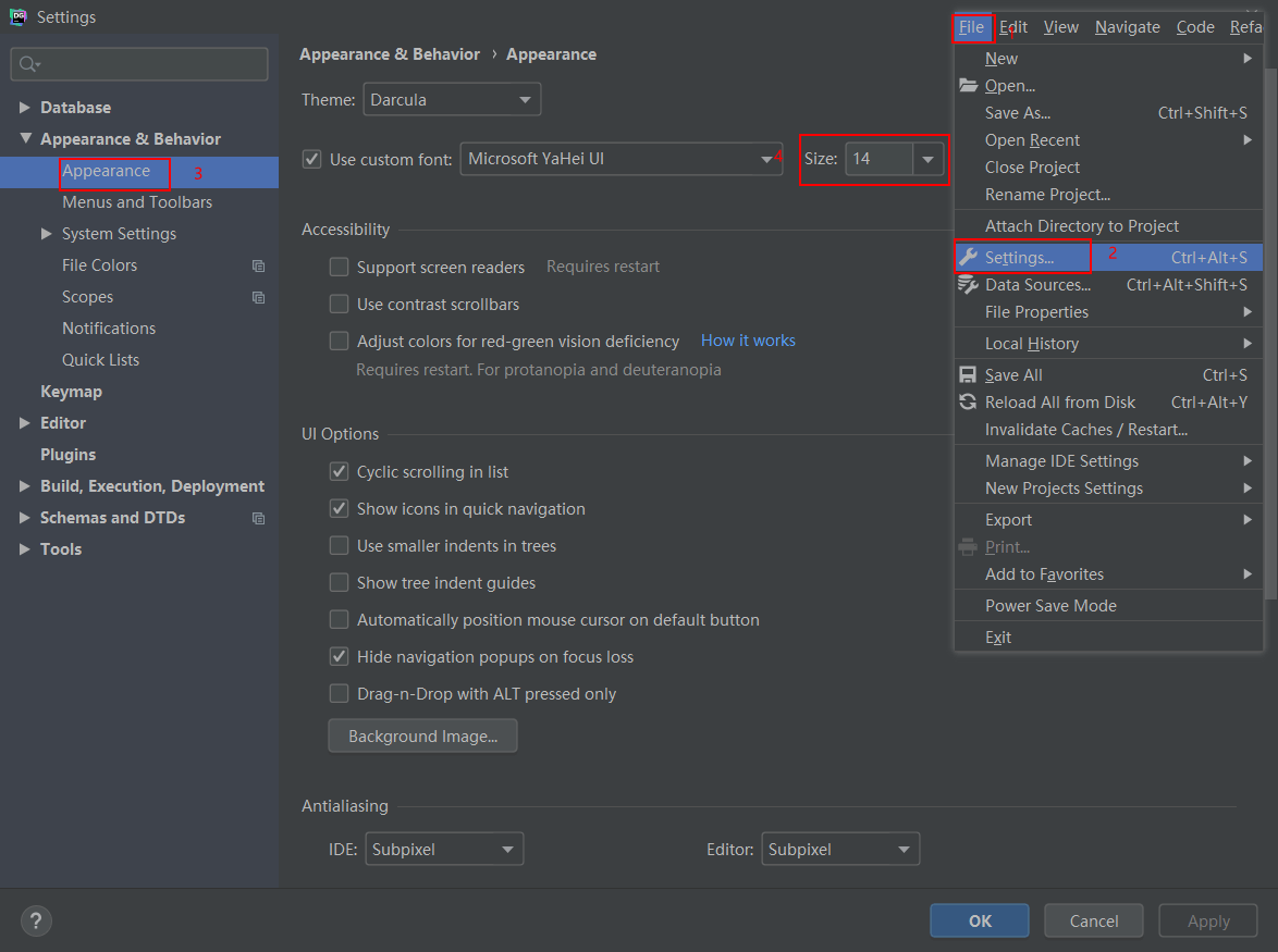 File->Settings打开软件设置(用过IDEA的朋友一定很熟悉),然后可以设置软件外观的字体大小;