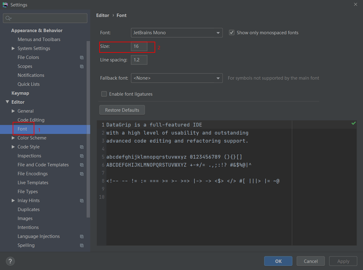Editor->Font配置可以调整编辑器字体大小。