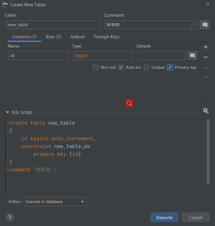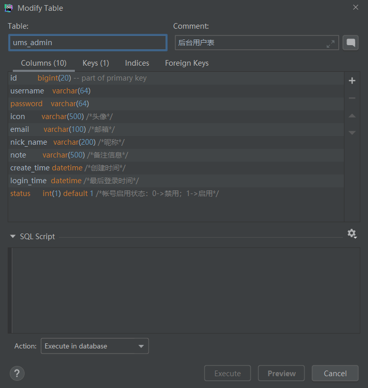 - 新建时可以添加表中的列,并且可以预览对应的SQL脚本;