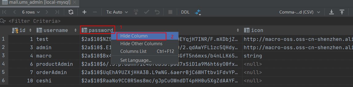 - 有时候有些列的数据我们并不关心,可以右键表头选择隐藏列来隐藏它;