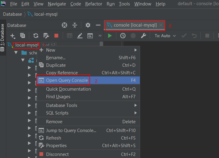 - 打开查询控制台,右键数据库,选择