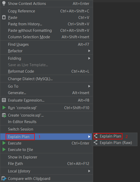 - 查看执行计划,选中目标SQL并右键,选择