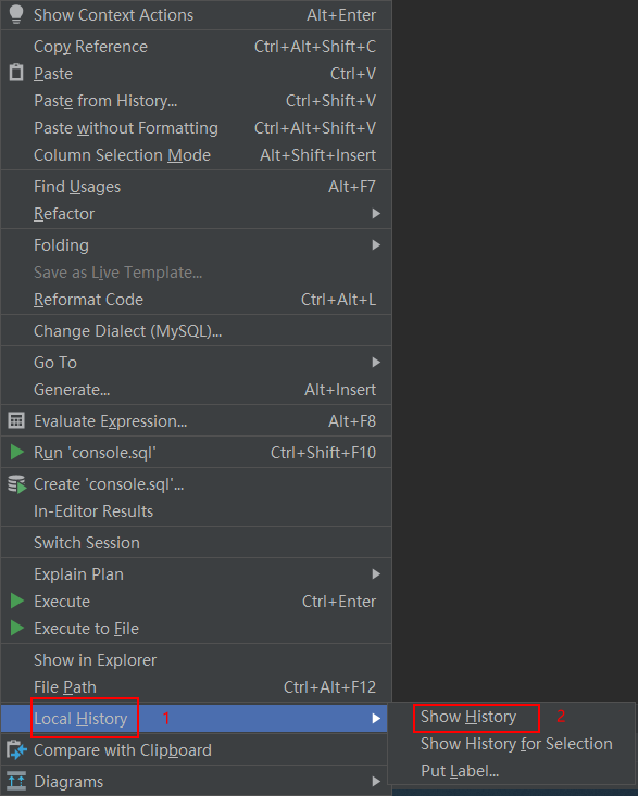 Local History->Show History可以打开查看SQL执行的历史记录;