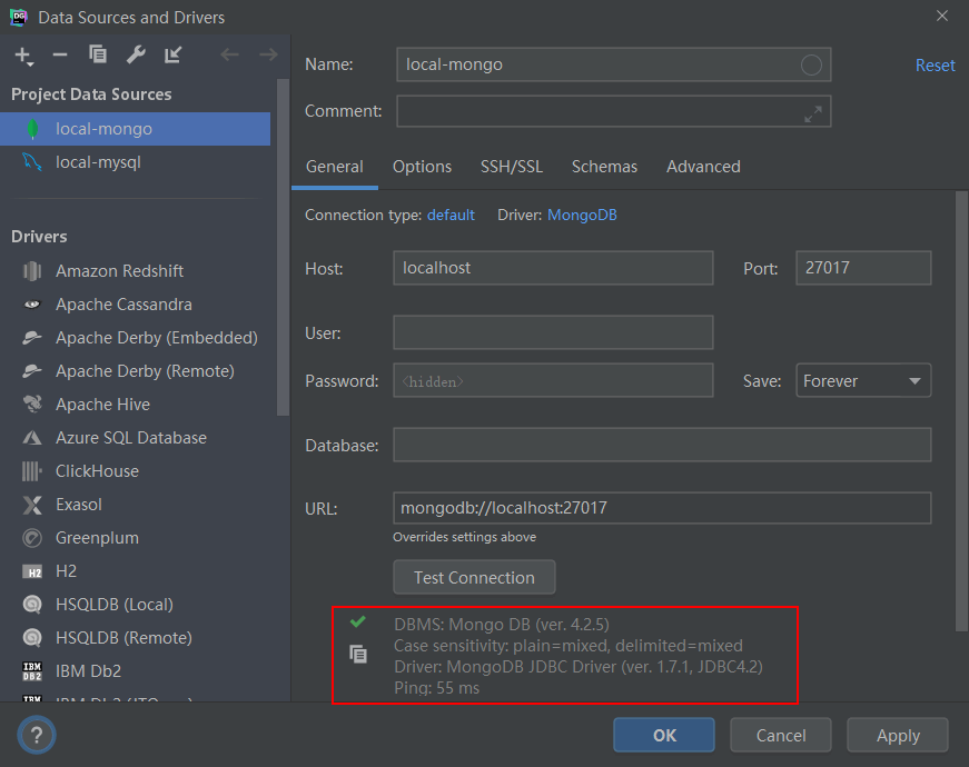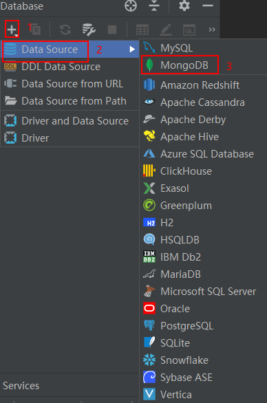 左上角的加号->Data Source->MongoDB来创建一个MongoDB的数据源;