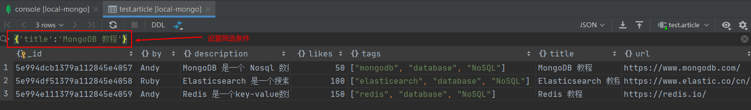 - 查看集合中的信息,可以设置筛选条件;