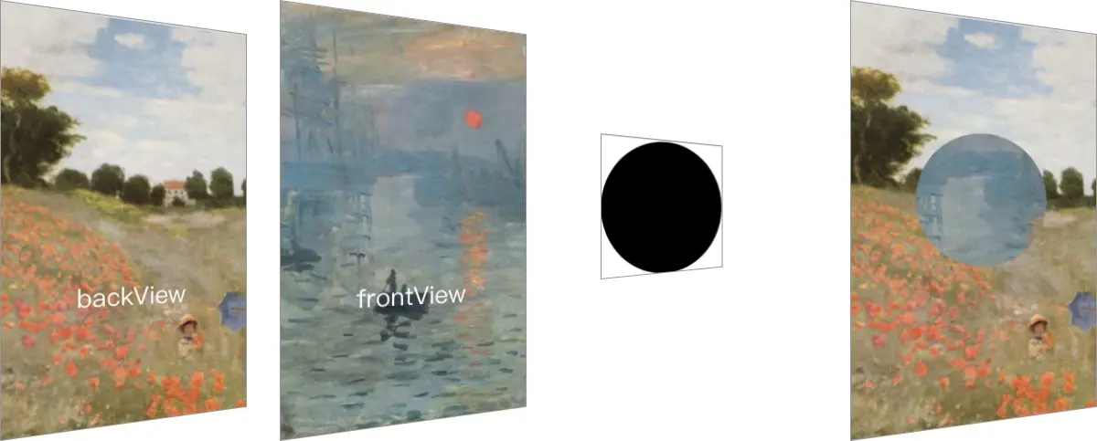 从这张图中,我们可以看到:frontView.mask 只影响了 frontView 哪部分可以被我们看到 ,对后面的 backView 没有任何影响。 看上去,mask 更像是对 view 进行了裁剪。