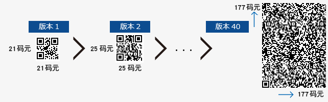 QR码设有 1 到 40 的不同版本(种类),每个版本都具备固有的码元结构(码元数)。“码元结构”是指二维码中的码元(码元是指构成QR码的方形黑白点)数。从version 1(21码元×21码元)开始,在纵向和横向各自以 4 码元为单位递增,一直到 version 40(177码元×177码元)。