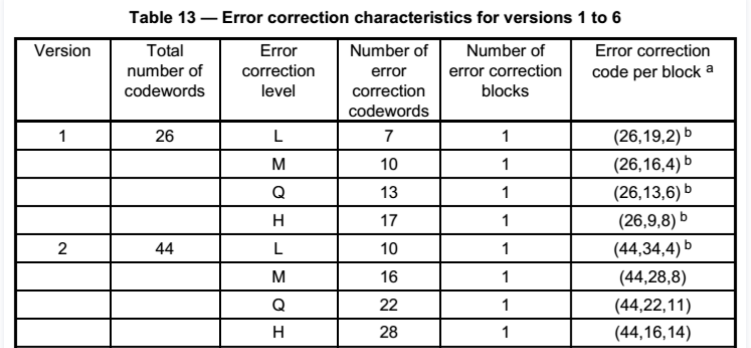 - 纠错块码字数(Error Correction Code Per Blocks):每个块中的码字个数,即有多少个字节 Bytes;